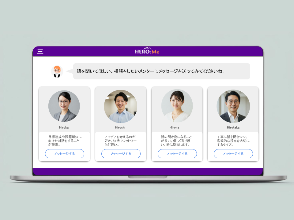 HERO Meは、社員が自分の相性や心境、課題に合わせて、相談相手となるAIメンターを自分で選べる対話型AIツールです。
