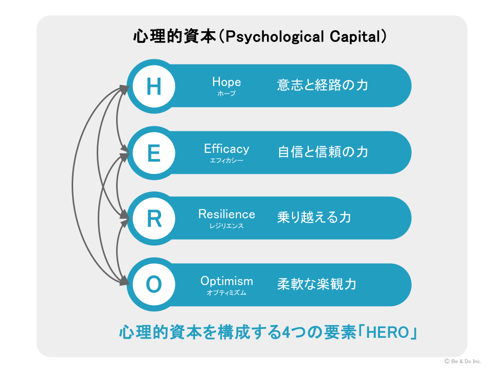 心理的資本は、以下の4つの要素「HERO」から構成されています。