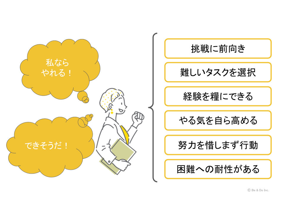 - 挑戦を前向きに受け入れ、難しいタスクや高い目標を自ら選ぶ
