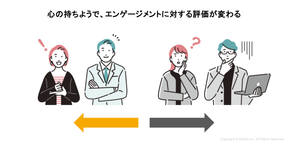 会社が提供する制度は等しくても、本人の受け取り方によってエンゲージメントは大きく左右されます。この「受け取り方のフィルター」こそが、個人の心の持ちようによるものなのです。