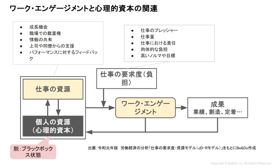 「労働経済白書」でも引用されているJD-Rモデル(仕事の要求度―資源モデル)に基づくと、成果(業績や定着)に繋がるワーク・エンゲージメントを高めるには、2つの資源が不可欠です。