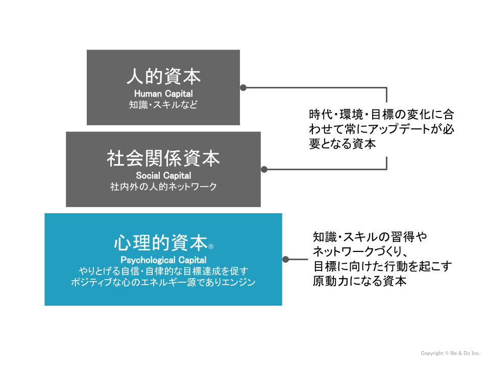 「心理的資本(Psychological Capital/略称PsyCap)」とは行動を起こすための前向きな心理的エネルギーです。近年、人材を資本と捉えて経営に活かす「人的資本経営」が注目されていますが、心理的資本は人的資本のコア(土台)です。知識・スキルである人的資本(知識・スキル)や社内外の人的ネットワーク(社会関係資本)を活かすためには、心理的資本が鍵となります。