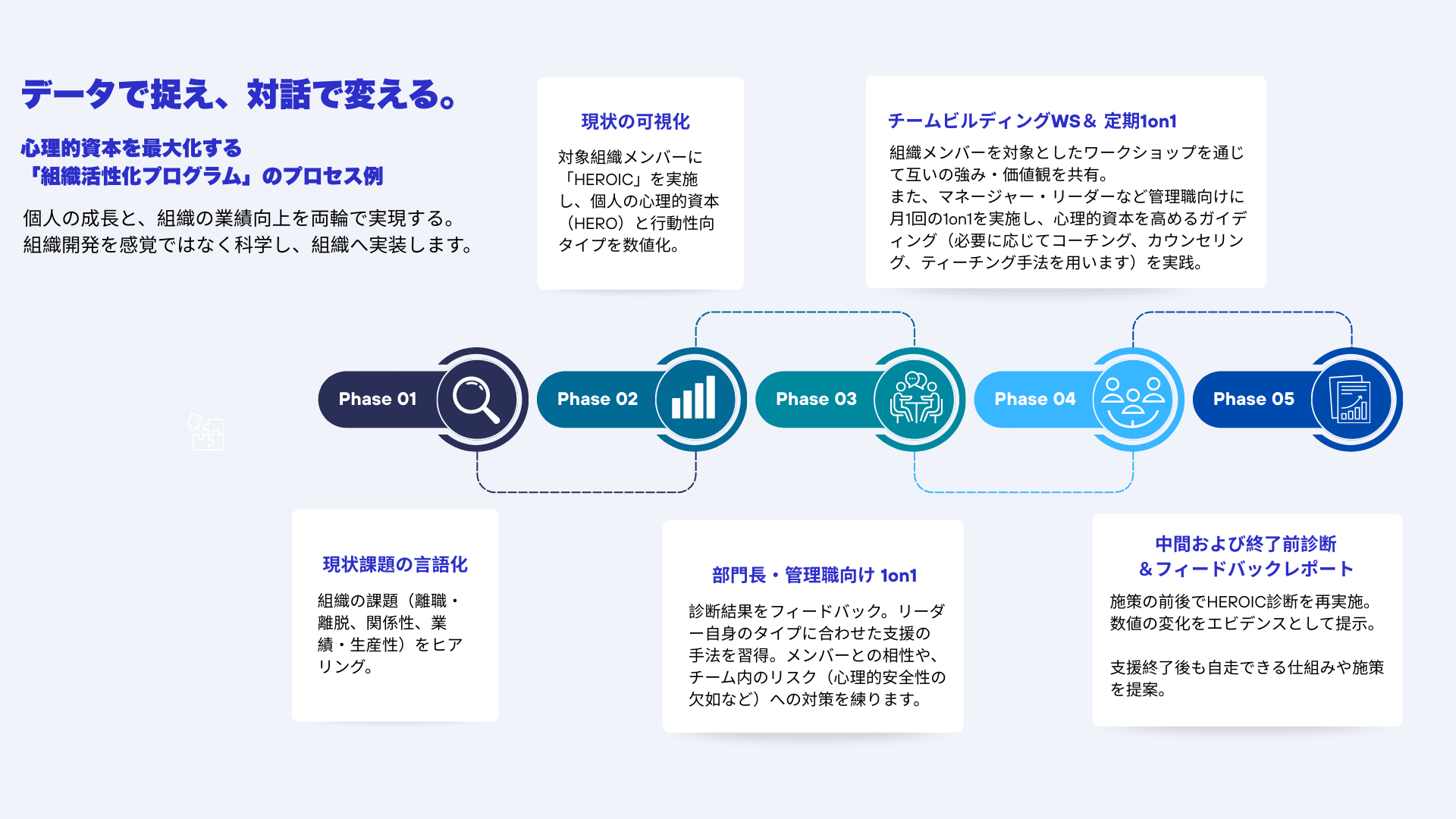個人の成長支援だけでなく、組織全体のコンディションをレポート化します。「心理的資本診断」や「行動性向データ」を用い、組織の強みやリスク(例:自信の喪失、特定の思考特性への偏りなど)を分析。経営層や人事部門へ、組織開発のための具体的な示唆を含めた報告書を提供します。